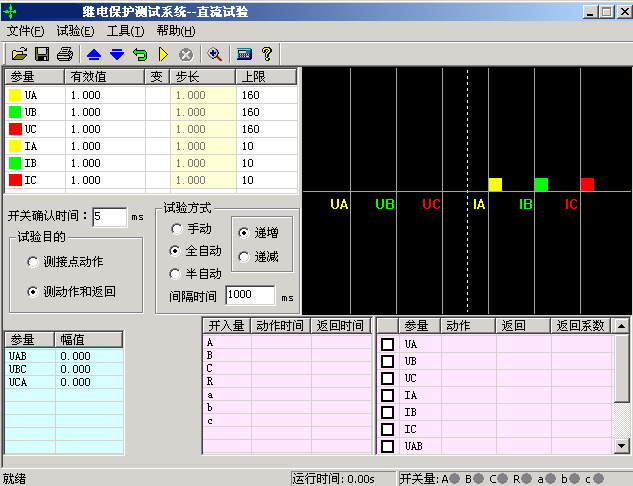 直流試驗(yàn)?zāi)K提供專門(mén)的直流電壓和電流輸出,主要是為了滿足做直流電壓繼電器、時(shí)間繼電器以及中間繼電器等試驗(yàn)的要求。直流模塊的主界面如圖所示: