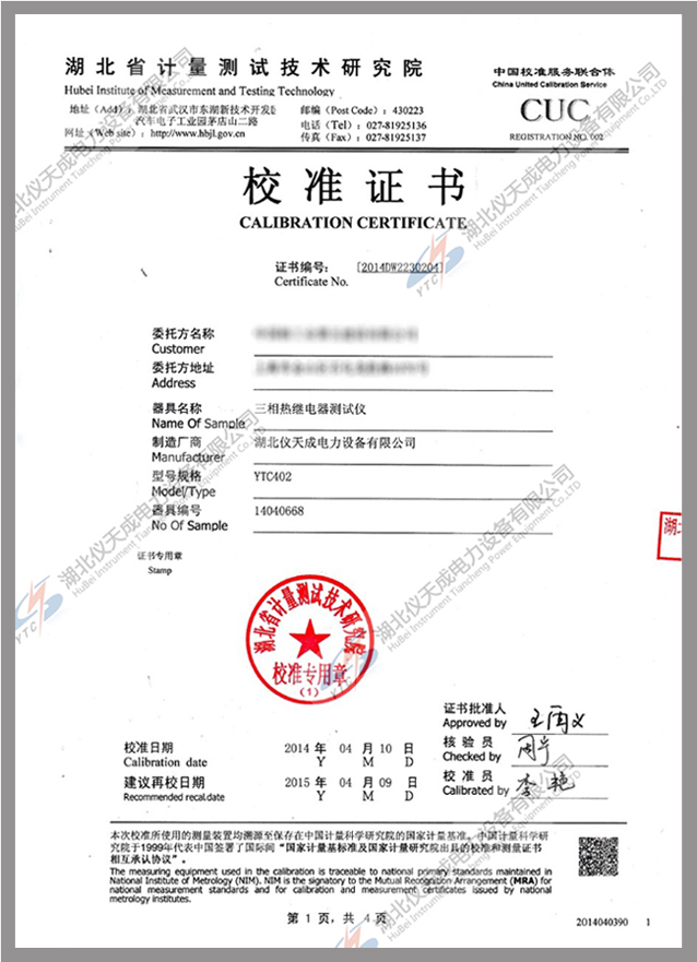 轉載:"YTC402三相熱繼電器測試儀鑒定證書" 請注明來源于儀天成電力。 更多技術問題請致電儀天成電力客戶服務:027-87876585,技術部專線:027-87876585,在線客服:719388481
